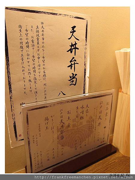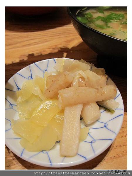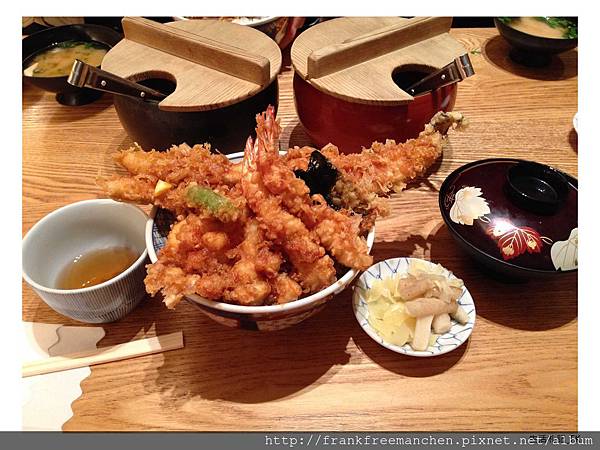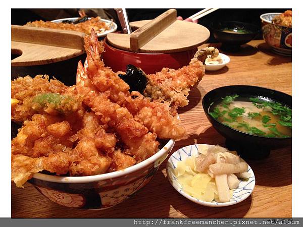 桌上除了主角天丼外, 還有配角醃漬牛蒡與薑。其實搭配油炸物來食用,不但可以去油解膩,還外加一份清爽口感。